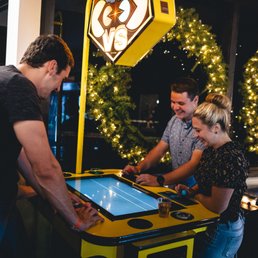 Fun arcade with a variety of games. Our group was obsessed with playing Killer Queen. I didn't try any of the ciders, but their thin artisan pizzas are yummy. Air conditioning is on full blast, so bring a sweater! It also gets pretty loud inside, but they have seats outside overlooking the river, which are perfect for taking a relaxing break. The parking lot is pretty big and we had no issues finding a spot on a Saturday evening.